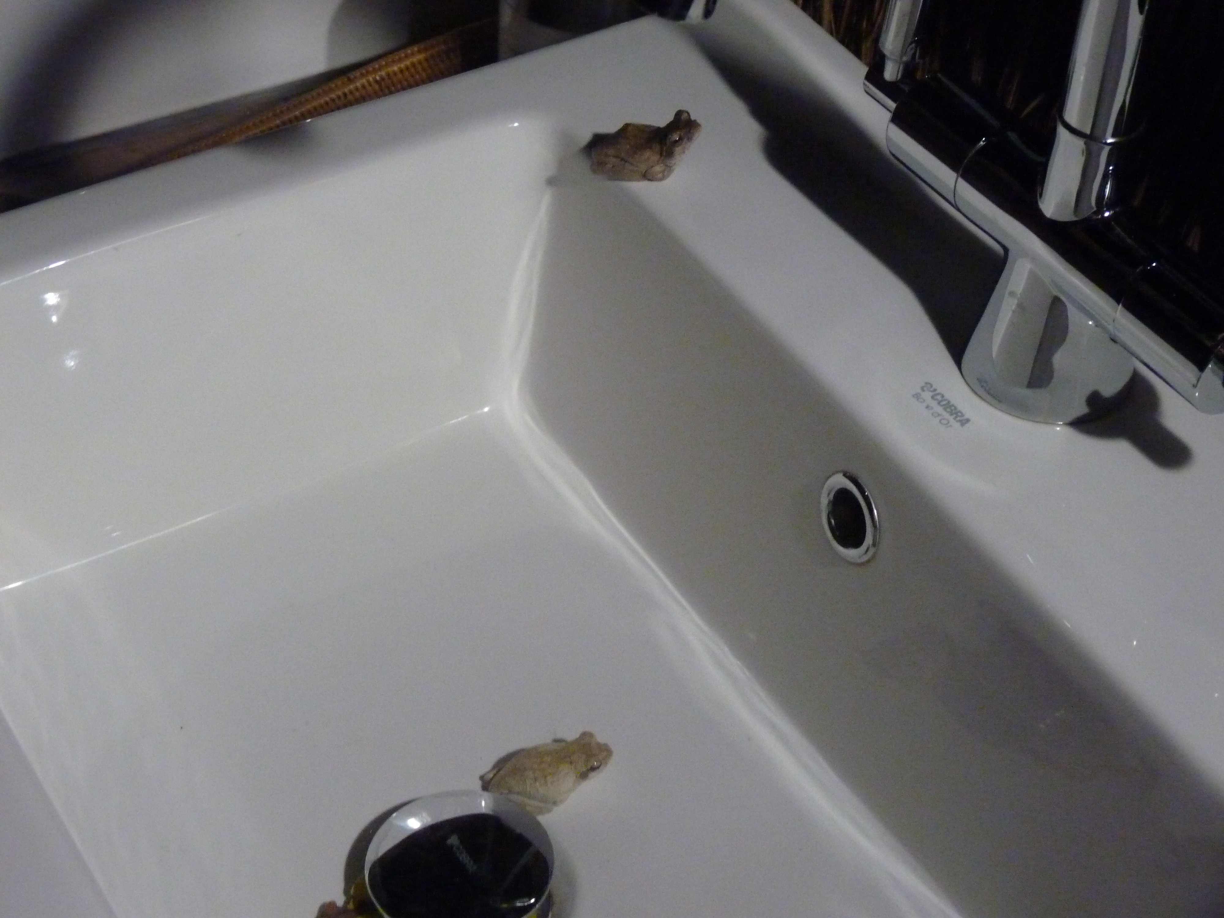 DSCF4040More great food for brunch and tea, then our evening drive highlighted by hippos and honey badger. Little did we know that a honey badger was undermining the plumbing at camp until we tried to take a shower before bed: there was no water on tap. We entertained ourselves by feeding the frogs in the sinks before retreating under our mosquito netting for the night.