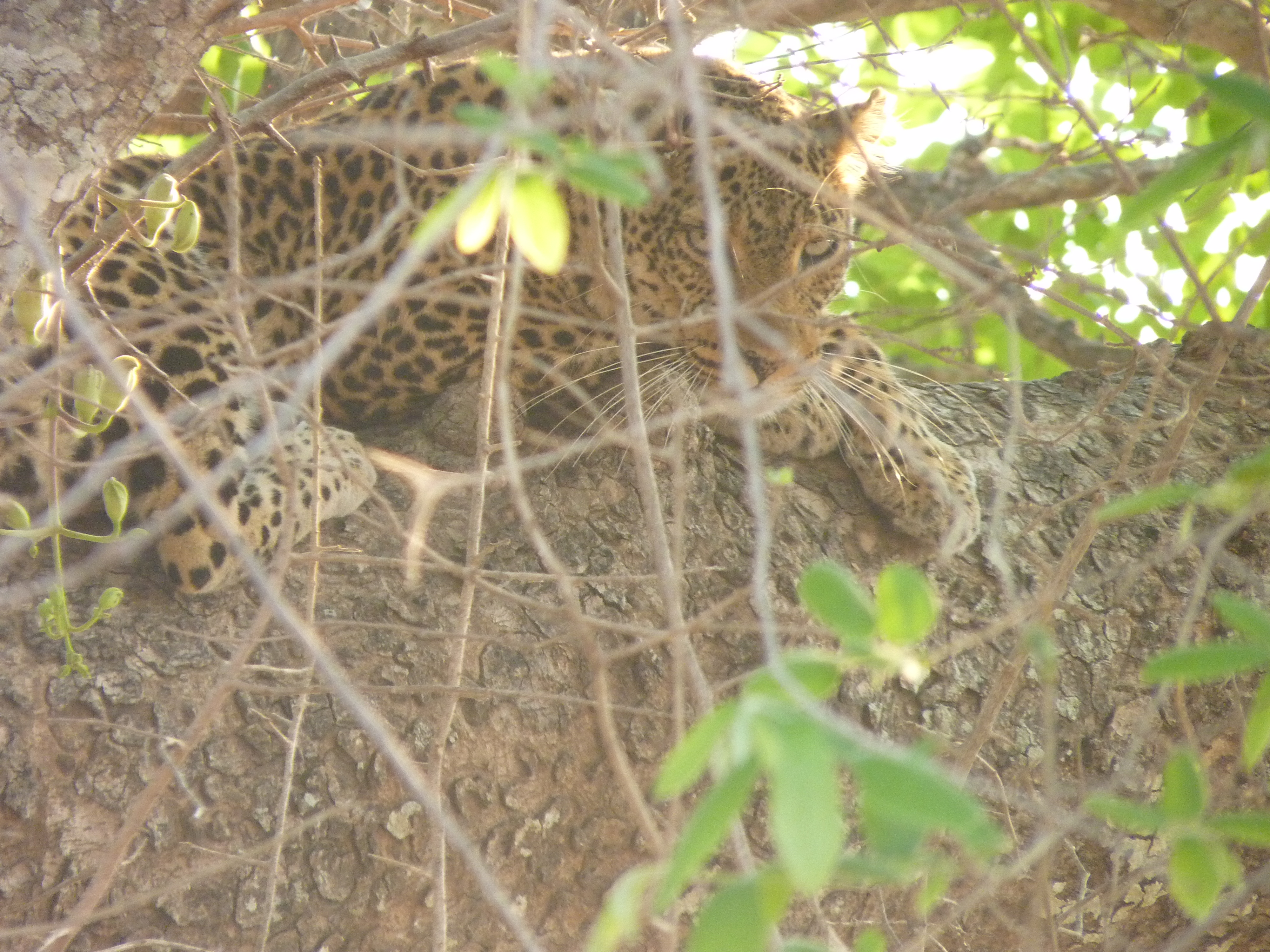 P1010197Despite the extra early hour, Zhila (the camp manager) and Doc (who really runs the place) are up to make coffee and see us off. Our new friend Kelvin is behind the wheel, taking us back to Mfuwe Lodge for our airport shuttle. The two-hour and a half hour drive back to the lodge is like a scrapbook of all that we loved about this trip: the spectacular sunrise and it’s cloak of colors, fish eagles and bee eaters and yellow billed kites, zebras, warthogs, puku, kudu, impala, giraffe, water buffalo and elephants all put in an appearance. And suddenly around the corner, hanging out in a sausage tree next to the road: a leopard, looking mildly annoyed to be discovered, averting his gaze to that “you can’t see me” kind of cat-attitude.